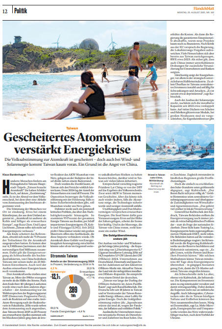 Mein Artikel über Taiwans Energiesicherheit, der am 24.8.2025 online und einen Tag später im gedruckten Handelsblatt erschien, endet so:
